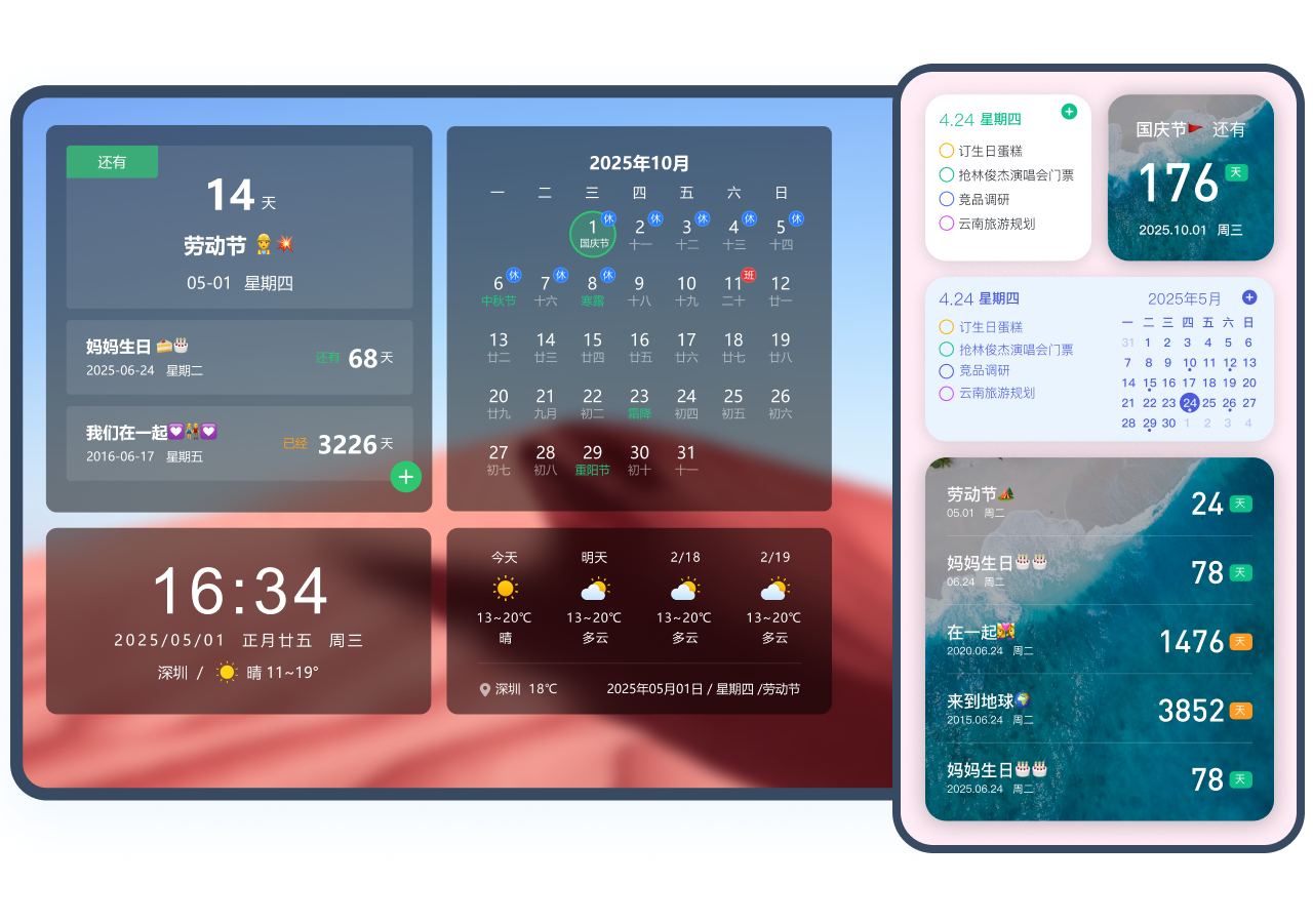 • 集成倒數(shù)紀(jì)念日、時(shí)間天氣等豐富組件